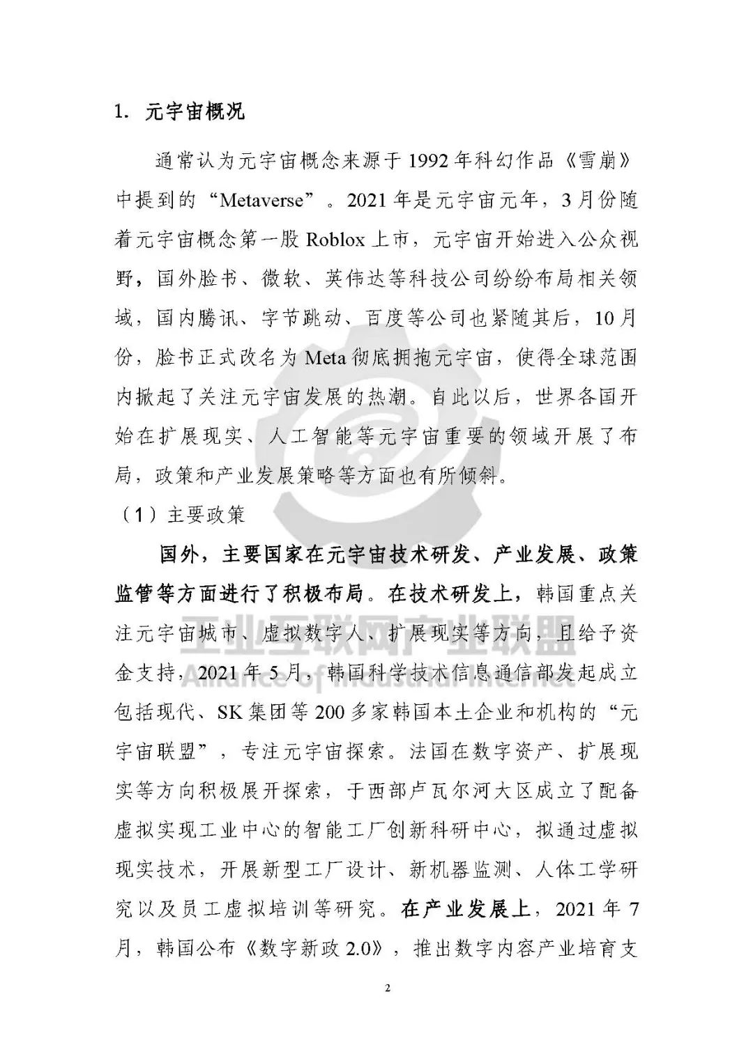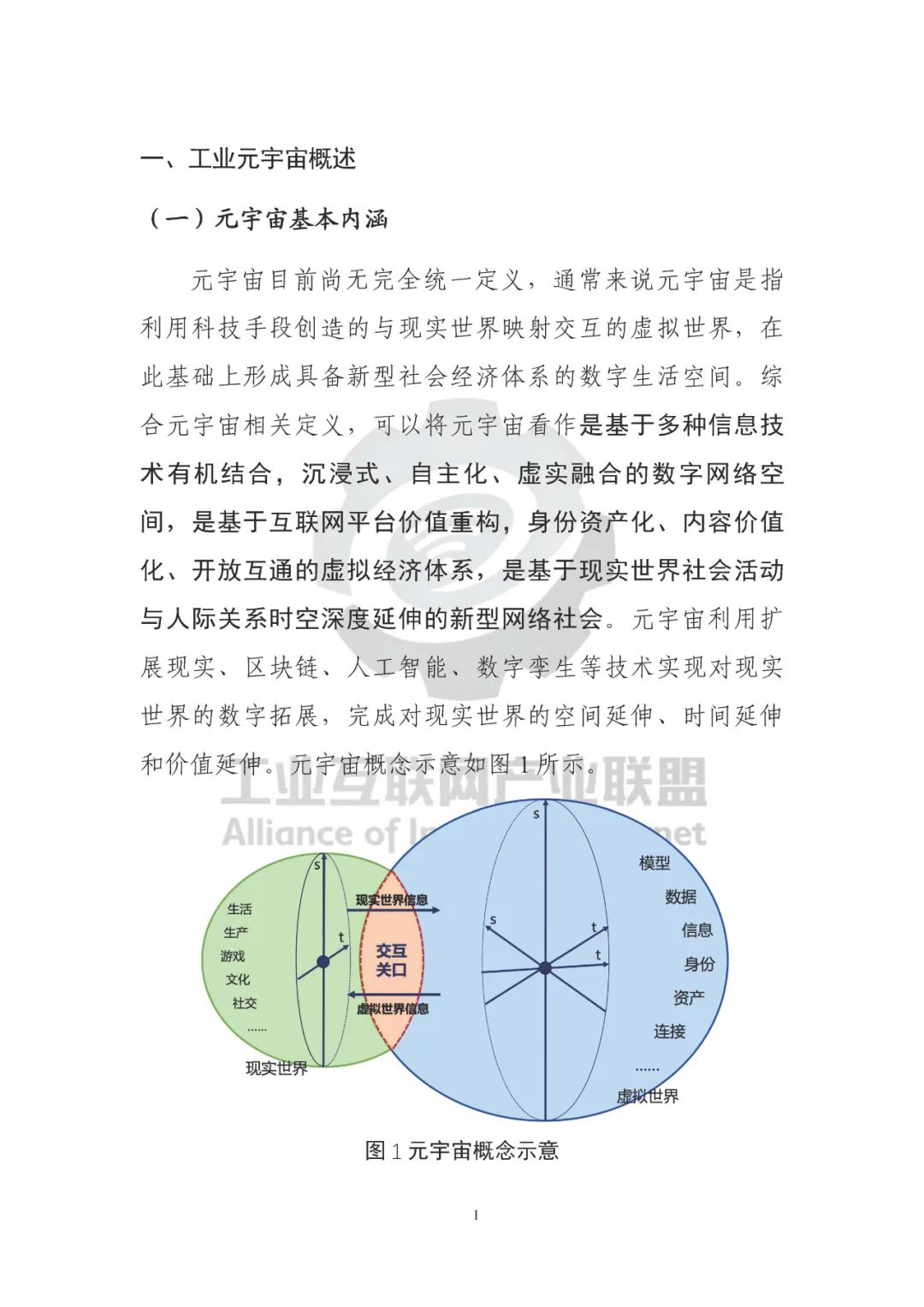 2021年3月,随着元宇宙概念第一股Roblox上市 ,元宇宙引起全球广泛关注,脸书、微软、英伟达、 腾讯、字节跳动、百度等纷纷布局相关领域。元宇宙 是构建在新型基础设施之上,实现虚拟世界和现实世 界时空融合的新一代互联网应用和社会生态。元宇宙 通过区块链、人工智能、扩展现实、数字孪生等技术 ,实现对现实世界的镜像映射、时空拓展和价值延伸 ,帮助人们实现在虚拟世界的数字化身,进而借助扩 展现实等人机交互手段实现虚拟世界和现实世界的融 合。工业元宇宙是元宇宙重要的应用领域,是基于元 宇宙核心基础设施和应用理念,构建的服务于工业经 济的新型工业体系、工业生态和工业模式。工业元宇 宙可以在虚拟世界中实现对工业全要素、全价值链、 全产业链的全息展示和跨时空聚合,并叠加新的社交 模式和新型经济模式,进而借助人机交互、数字化身 等手段协同开展工业生产经营活动,促进工业转型升 级及创新发展。工业元宇宙概念较为前沿,涉及的技术复杂,产 业类型多,工业元宇宙的产业生态体系尚未建立完善 ,但围绕工业元宇宙的应用探索正在逐步展开,国内 外都在加强相关布局。为了凝聚共识,引导业界协同 开展工业元宇宙探索,工业互联网产业联盟特编制本 报告,对工业元宇宙的概念内涵、可能引发的变革、 概念框架、支撑体系进行了阐述,并给出了推进建议 ,希望为工业元宇宙的落地应用和产业发展提供参考 和借鉴。