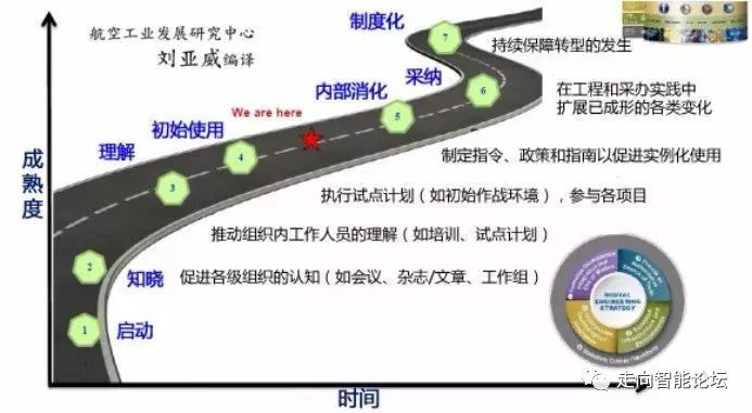 2015年8月美军成立数字工程工作组,陆海空三军、国防信息系统局、国防后勤局、导弹防御局等国防部成员、航空航天局等相关政府部门、国防工业部门、系统工程组织等共同研究讨论推进事宜,制定了数字工程路线图。路线图给出了数字工程推进7个成熟度等级,分别是启动;知晓——促进各级组织的认知;理解——推动组织内工作人员的理解;初始使用——执行试点计划,参与各项目;内部消化——制定指令、政策和指南以促进实例化使用;采纳——在工程和采办实践中扩展已成形的各类变化;制度化——持续保障转型的发生。截止到2017年10月,美军数字工程推进工作已经处于4级到5级之间,完成了若干计划,正准备更新政策指南。根据美军数字工程路线图,2017年12月,美军将正式发布数字工程战略文件,2018年6月,完成政策和指南的更新,并且开始在项目中对数字工程应用实施评价,2019年12月,美军开始将数字工程转移到采办流程中使用。
