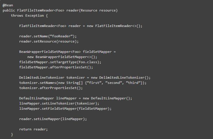 如前所述,Spring Batch 4 是 Spring Boot 发布以来的第一个主要版本。在这个版本中,改善了让用户的 Java 配置体验。所有 ItemReader 和 ItemWriter 实现现在都可以使用构建器。使用 Spring Batch 3 的 Java 配置功能,将需要如下所示: