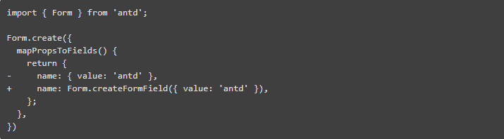 新增 Form.createFormField 方法,mapPropsToFields 返回的字段都需要由该方法创建。