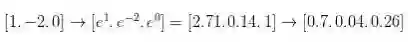 举个例子,假设3个分类的原始分数是[1, -2, 0],那么softmax函数就会计算: