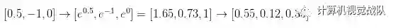 这样算出来的分数也会更小,假设小了一半吧[0.5, -1, 0],那么softmax函数的计算就是: