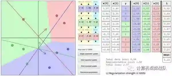我们实现了一个交互式的网页原型,来帮助读者直观地理解线性分类器。原型将损失函数进行可视化,画面表现的是对于2维数据的3种类别的分类。原型在课程进度上稍微超前,展现了最优化的内容,最优化将在下一节课讨论。
