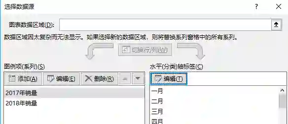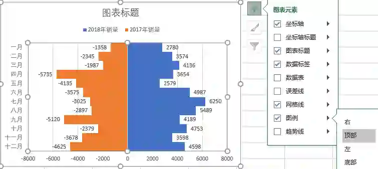 右键单击图表区域,”选择数据“设置框中,把”2017年销量”系列上移;