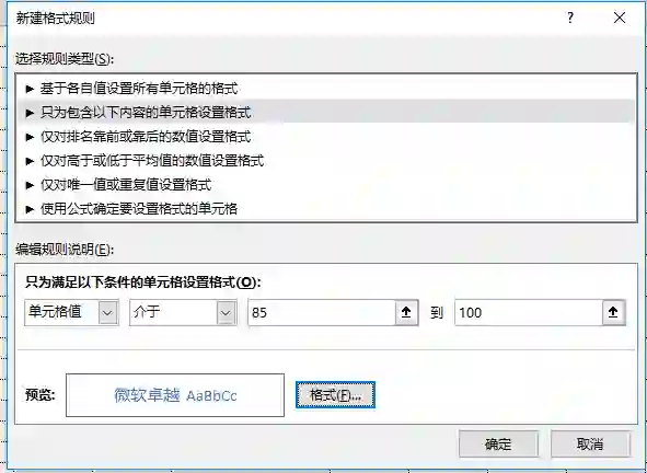 (2)弹出的窗口,选择“新建格式规则”下的“只为包含以下内容的单元格设置格式”,选择“介于”,“85-100”,“格式”下选择蓝色,确定;