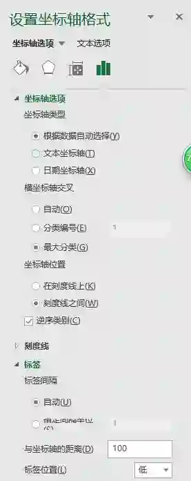 (4)设置坐标轴格式,“横坐标轴交叉”选“最大分类”,“逆序类别”前打勾,“坐标轴标签”选“低”,确定后效果如图;