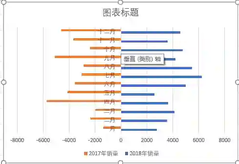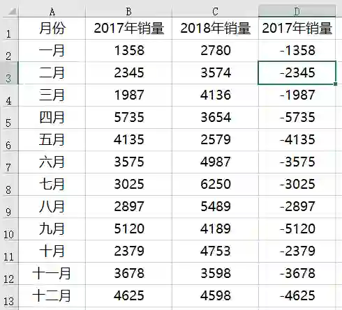 (1)数据表是2017和2018年的同比数据,为了作图需要,在D列再添加辅助列“D2=-B2”,向下填充;