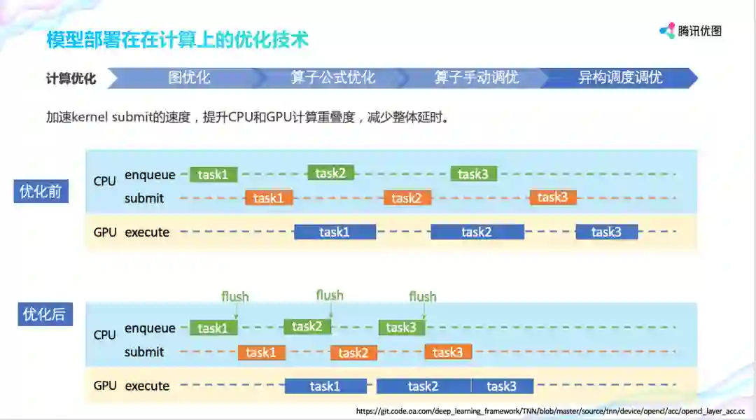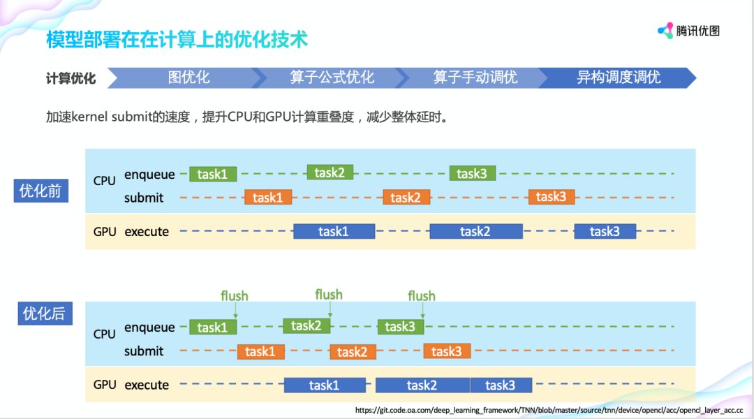 异构调度优化。CPU 在提交计算任务后,GPU 并不一定马上进行计算,这加大了整体任务的时延。TNN 在提交任务时可以手动触发以提高计算的优先级,这样 GPU 实际执行的时间得到提前。以图中 task3 为例,几个色块直接存在 gap,而优化后消除了 gap。