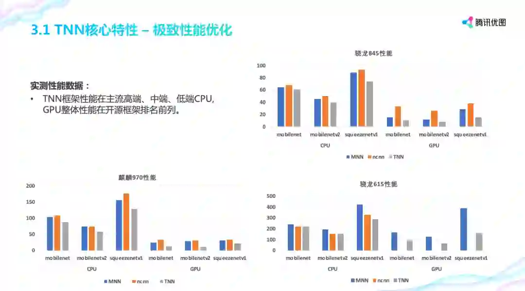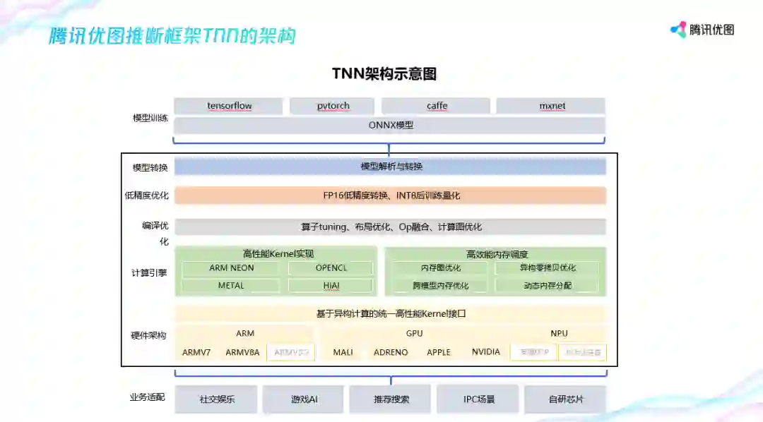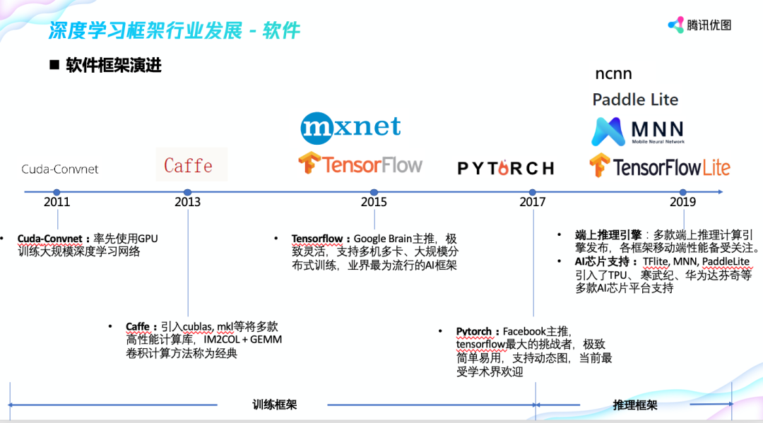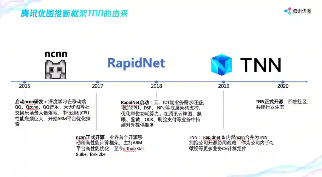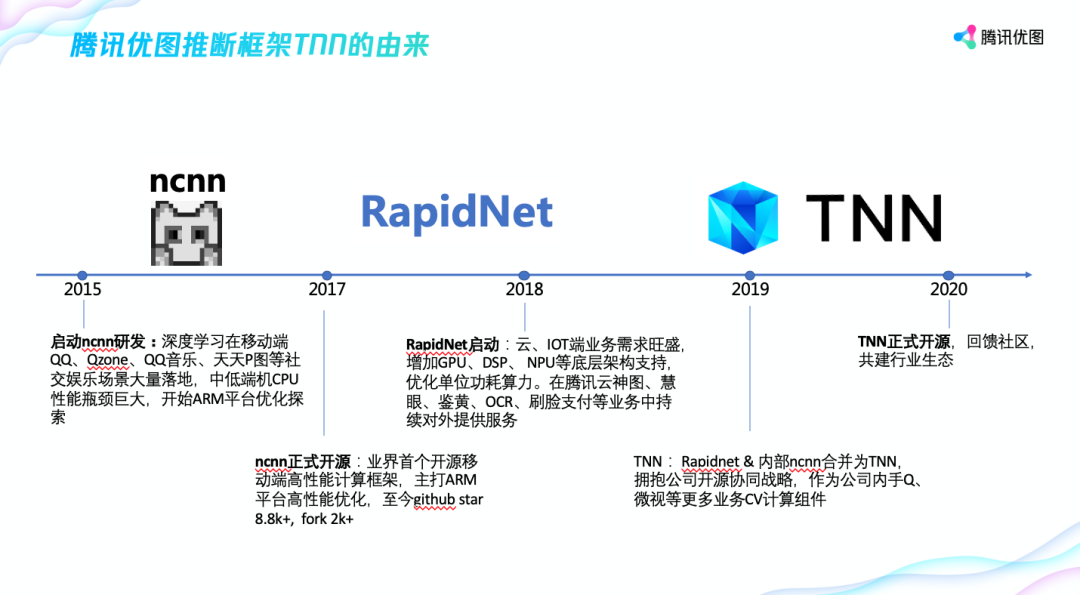 早在 2015 年,在 Tensorflow 等训练框架出现之前,腾讯优图就开始了推断框架的布局。2017 年,优图实验室开源了 ncnn 推断框架,这是首个专注于移动端的开源推断框架。2018 年,伴随着部门业务场景由 2C 转向 2B,云、IoT 端业务需求变得旺盛起来,英伟达 GPU 和 AI 专有芯片拥有巨大的性能和成本优势,为此优图内部整合了之前移动端的经验并适配英伟达 GPU 和 AI 专有芯片推出新的框架 RapidNet。2019 年后公司大力推行开源协同战略,优图实验室协同公司其它做框架的部门如天天 P 图团队、TEG 的 AI 平台部一起推出的 TNN 框架,并于 6 月 10 日全球开源。