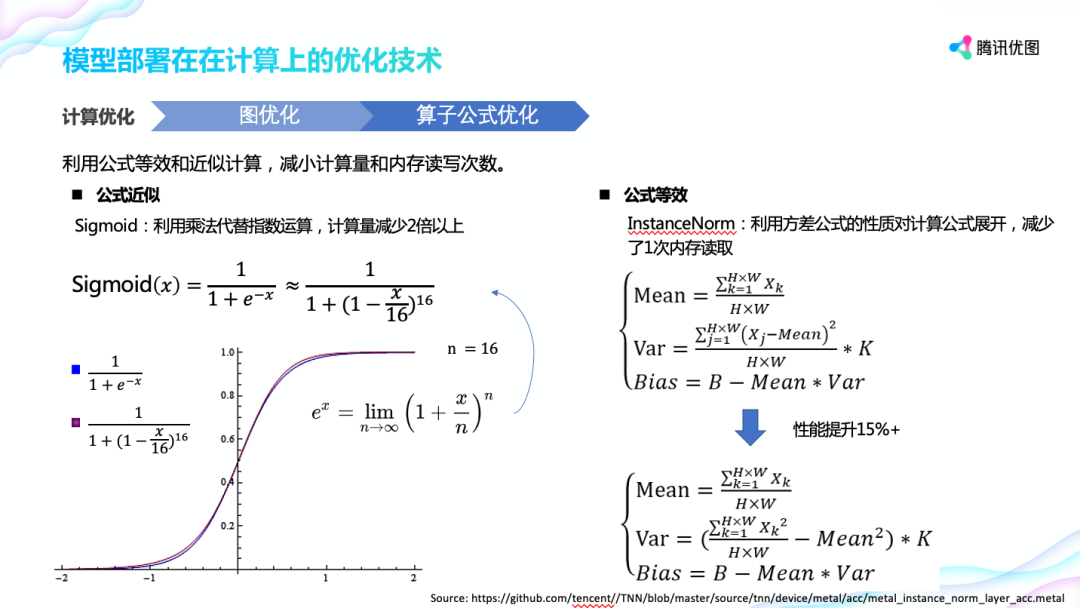 公式近似,以 Sigmoid 为例,根据指数函数的定义,取 n=16, 从图形上看,两者曲线非常近似,而 通过这种利用乘法代替指数运算的方式,sigmoid 的性能提升了 2 倍。