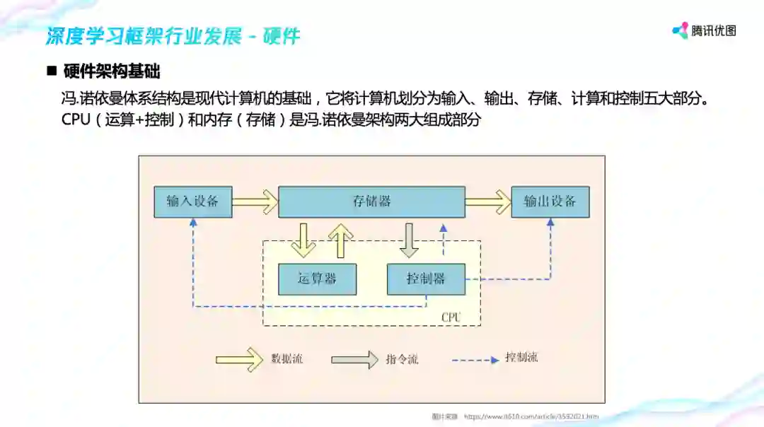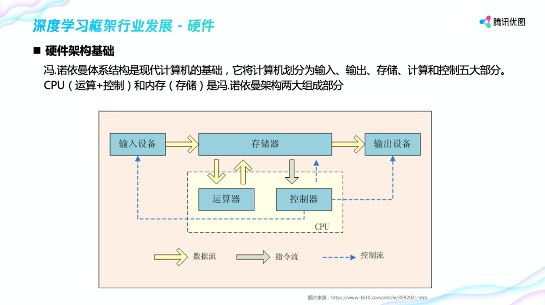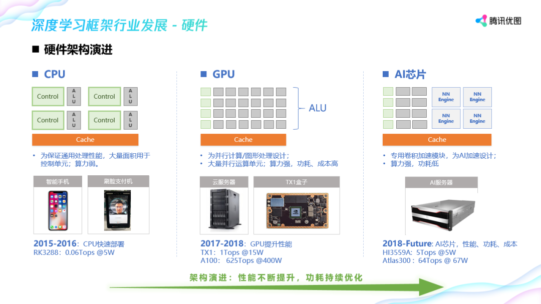 在硬件架构的演进中,CPU 为保证通用处理性能,大量面积用于控制单元,像应用于计算的 ALU 单元就比较小,导致算力比较弱。