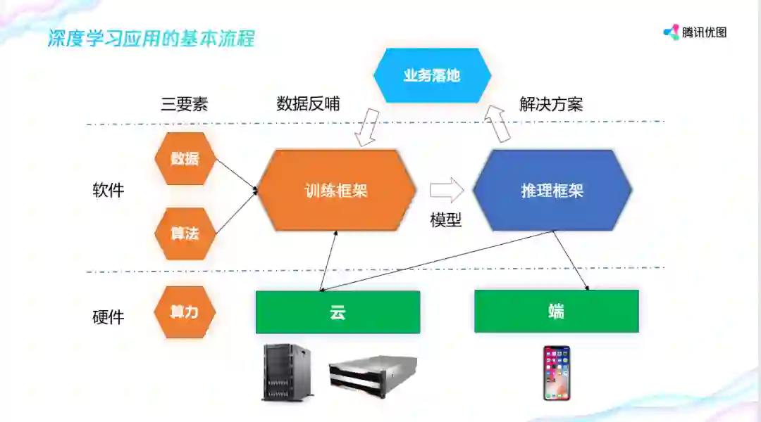 在硬件层面又分云和端侧,云端硬件以英特尔和英伟达的服务器为代表,端侧则包括手机和摄像头等。在软件层面,数据和算法通过训练框架练出算法模型,然后与推理框架结合,形成各种各样的解决方案在业务中落地。业务落地之后又会反哺实际业务场景的一些数据给到训练框架,这样一个循环过程使算法模型在业务场景下的精度越来越高。