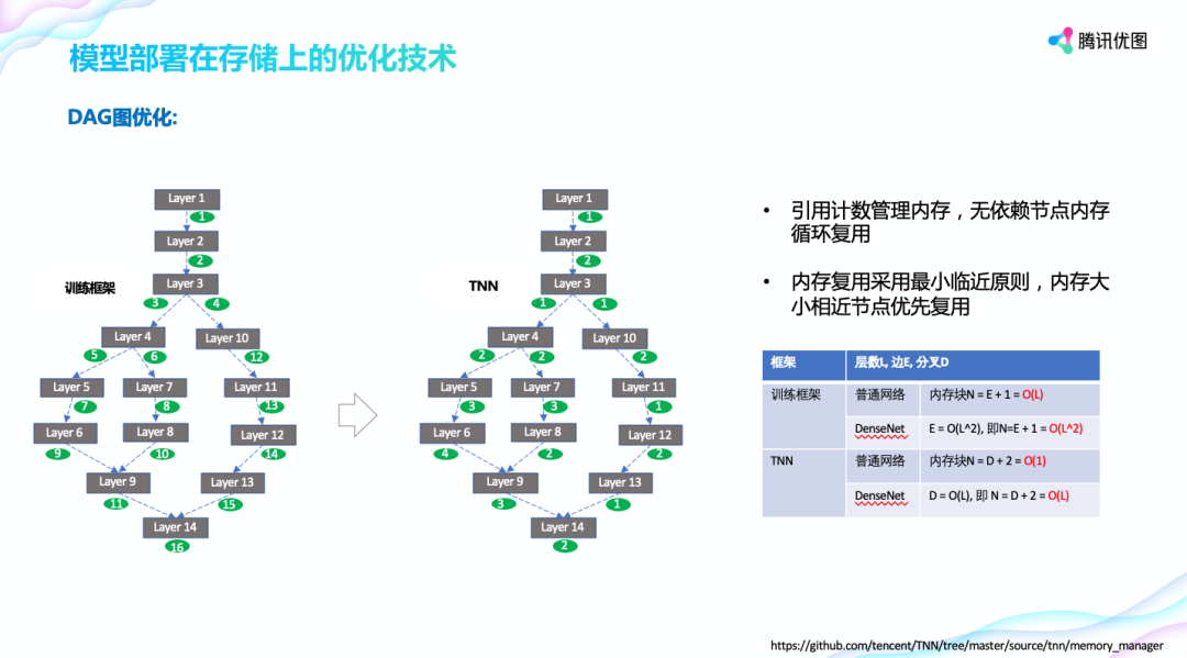 关于内存使用量,腾讯优图引入引用计数管理内存,无依赖节点内存循环复用,极大的减少了内存使用量。 如下所示,左图是一般训练框架的内存使用示例,从图中可以看到需要 16 块内存,而使用引用计数后,通过循环复用,仅需要 3 块。