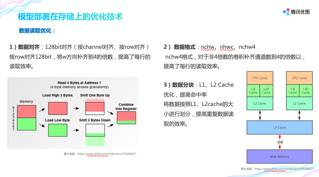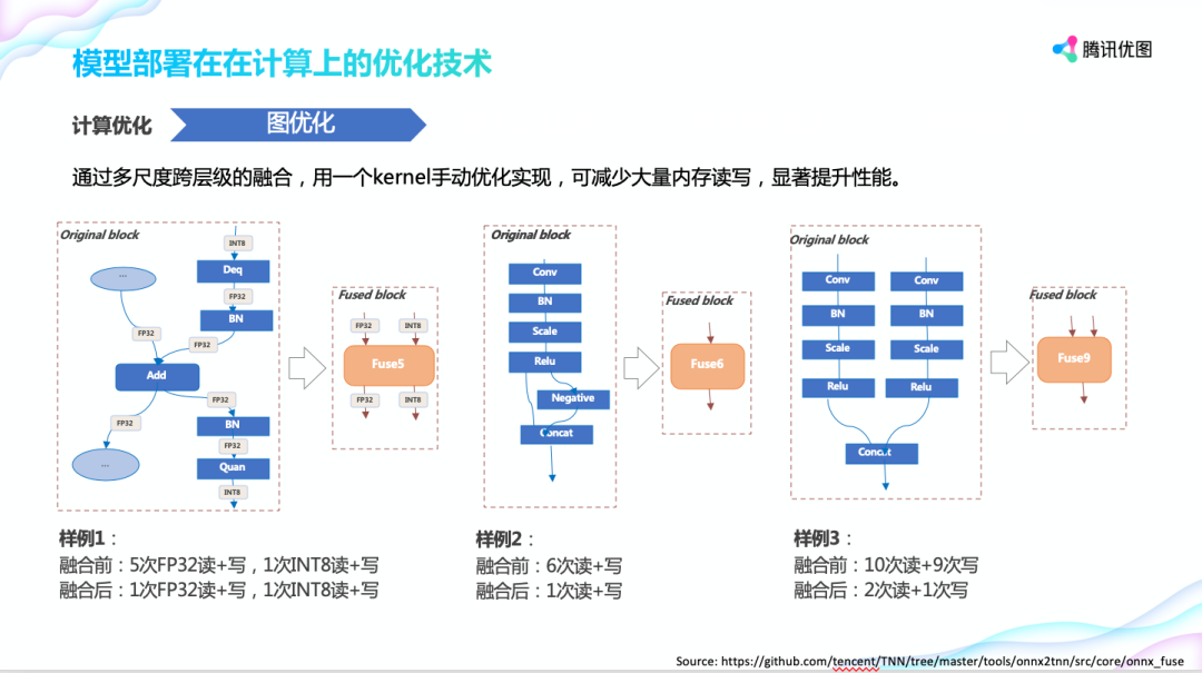 先讲图优化,Tensorflow、PyTorch 等框架生成的网络算子粒度小,存在很多粘合剂算子,导致深度学习网络包含成千上万的运算节点,这会带来线性增长的内存读写次数。TNN 采用图优化对网络进行等效融合,将复杂子图融合成单运算节点来精简整个网络,既减少计算量又减少内存读写。以右边为优化前整个计算流程需要 10 次内存读,9 次内存写,而优化后只需要 2 次读和 1 次写。