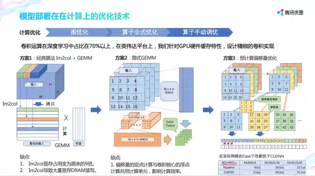 方案 2 隐式 GEMM 将数据就行分块这样它可以在 GPU share memory(高速缓存)进行迭代展开,且只占用固定大小。im2col 相关指令与矩阵乘法指令交替发射,相互掩盖延迟。
