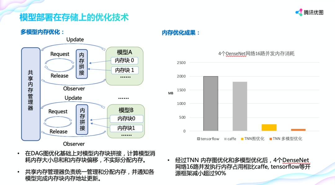 在单模型内存复用的基础上,TNN 引入共享内存管理器,让多个模型间进行复用,这样模型间只要使用最大的内存就可以。实际对比发现,在 DenseNet 网络上,上述优化方案可以带来 90% 的优化空间。