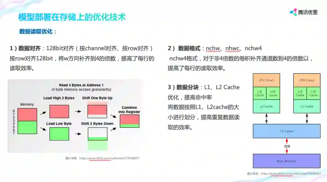 关于内存读写,TNN 尽量让要读取的数据是 128bit 对齐,以提高数据的效率。 如图,在读取 1 位置起始的 4byte 数据时,计算机先读取上面红色的 4byte 然后上移一个 byte,再读取绿色的 4 个 byte 下移 3byte,最后组合在一起,这样就花费了两次读的时间。解决办法是,在深度学习计算中对数据格式进行排布,比如采用 nchw4 格式的数据排布,将 C 方向上的 4 个值合并在一起,提高了每行的读取效率。