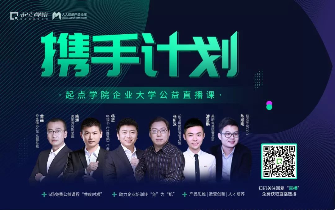 为了携手与企业一起战胜难关,转“危”为“机”。起点学院企业大学发起了“携手计划“公益直播课活动,通过直播的形式,邀请6位互联网实战派顶尖老师为大家分享产品思维,运营创新以及企业培养的干货。