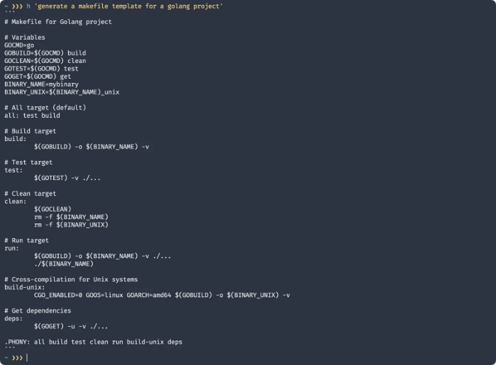 function openai_edits_apih 'can you generate a golang script that reads from stdin and sends that to the OpenAI Code Edits API endpoint - include only the code nothing else' | string replace '```' '' > openai_edits_api.goh 'can you generate the commands to build and run the golang script - only include the commands' | string replace '```' '' > openai_edits_api.shdata_gpt 'can you generate some tests for the following golang script' (cat openai_edits_api.go | string collect) | string replace '```' '' > openai_edits_api_test.godata_gpt 'can you generate a makefile for a golang project with the following files' (ls) | string replace '```' '' > Makefileend