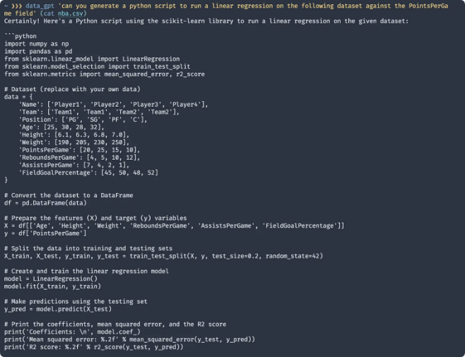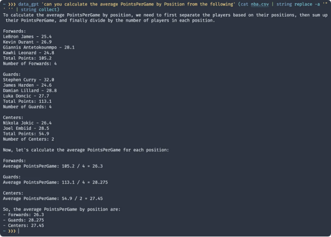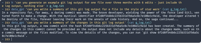 function data_gpt -a prompt dataset prompt_input (echo "$prompt: $data" | string join ' ')curl https://api.openai.com/v1/chat/completions -s \-H "Content-Type: application/json" \-H "Authorization: Bearer $OPENAI_API_KEY" \-d '{"model": "gpt-4","messages": [{"role": "user", "content": "'$prompt_input'"}],"temperature": 0.7}' | jq -r '.choices[0].message.content'end