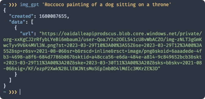 function img_gpt -a promptset create_img (curl https://api.openai.com/v1/images/generations -s \-H "Content-Type: application/json" \-H "Authorization: Bearer $OPENAI_API_KEY" \-d '{"prompt": "'$prompt'","n": 1,"size": "1024x1024"}')echo $create_img | jqset url (echo $create_img | jq -r '.data[0].url')set rand_num (random 1 1000000)curl -s $url -o img-"$rand_num".pngend