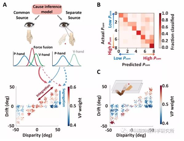 为了进一步定量的描述手臂拥有感与本体感觉偏移以及视觉-本体感觉信号输入之间的关系,研究人员利用贝叶斯因果推理模型对人和猕猴的行为结果进行了拟合(图1D)。该模型认为当视觉-本体感觉信息的空间位置越接近,大脑认为两者来自同一来源(common source)的概率越高,从而有更高的概率认为视觉手臂和本体感觉手臂两个信息来自同一来源,那就自我的身体(图2A)。拟合结果显示,人和猕猴对手臂视觉-本体感觉信息的整合都符合贝叶斯因果推断理论,并且模型所预测的视觉-本体感觉来自同一来源的后验概率(Pcom)与人类被试通过问卷汇报的身体拥有感打分存在显著的相关性。这些结果第一次发现,通过客观的行为学指标可以定量地测量猕猴对手臂的主观拥有感。