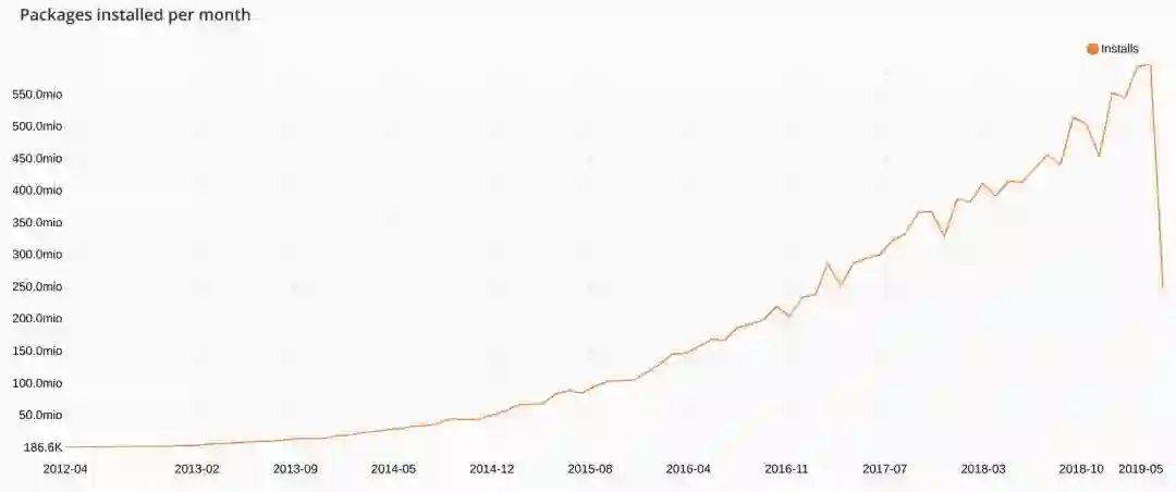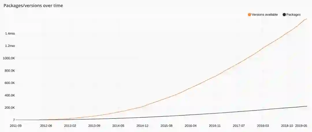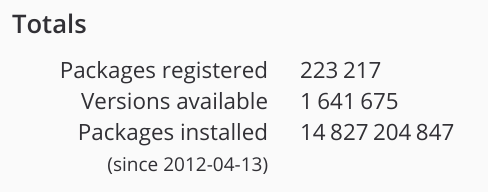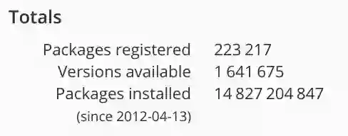 作者认为衡量 PHP 生态当前状况的一种方法是查看 Packagist 这个 PHP 主要软件包存储库的数据。通过以下趋势图,可以发现软件包数量呈指数增长,并且当前录入软件包有 223 217 个,总的安装量达到了 14 827 204 847,PHP 生态已不再像以前那么弱小。