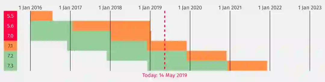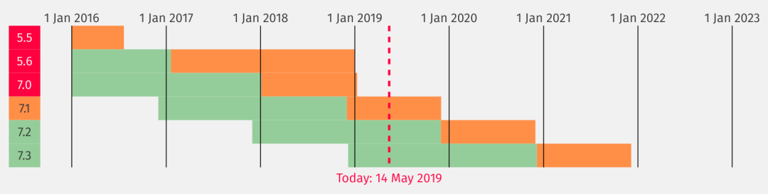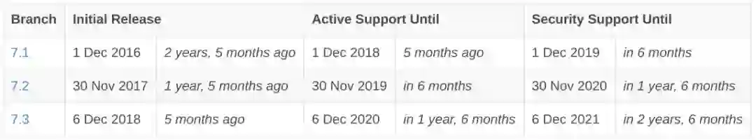 自从 5.X 时代以来,核心团队希望每年发布一个新版本,在过去四年中他们成功维护了这么一个发布周期。通常每个新版本都会得到官方两年时间的积极支持,之后有一年仅提供安全修复,其目的是激励 PHP 开发人员尽可能保持更新。