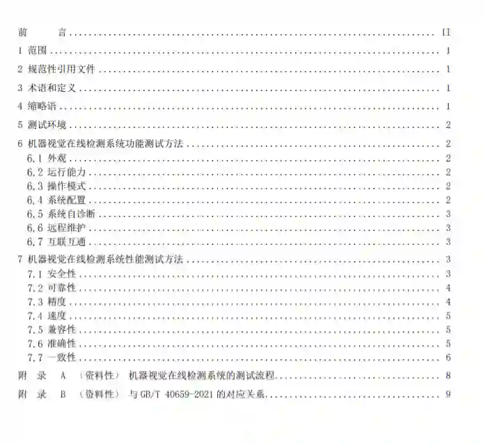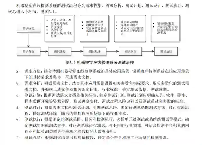 本文件通过对汽车、印刷、显示器件和电子等制造行业的调研,首先确 认了以机器视觉在线检测为对象的测试方法相关标准化需求。根据各行业的 标准化需求,结合机器视觉在线检测系统在开发、实施、使用过程中的通用 场景和技术路线,参考GB/T 40659-2021《智能制造 机器视觉在线检测系统 通用要求》相关技术要求,提出面向智能制造的机器视觉在线检测系统的测 试方法,包括集成测试、系统测试和互联互通测试,并在汽车、印刷、显示 器件和电子等制造行业的相关企业进行了验证。本文件规定了智能制造环境下机器视觉在线检测系统的测试方法,将帮 助设备、服务供应商和制造企业深入了解智能制造环境下机器视觉在线检测 功能和性能等相关的测试方法。本文件规定的内容可大大降低设备、服务供 应商和制造企业之间的沟通成本,统一大家的认知,可作为企业选择或评价 智能制造环境下机器视觉在线检测系统的依据。