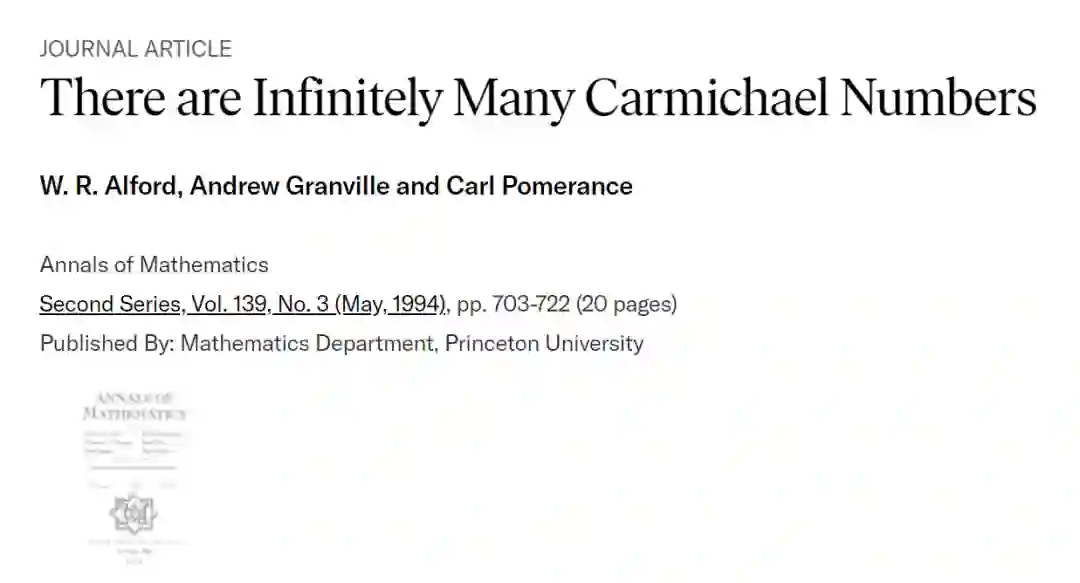 尽管数学家们质疑卡迈克尔数有无限多个,但与素数相比相对较少,这使得它们难以确定。之后在 1994 年,Red Alford、Andrew Granville 和 Carl Pomerance 发表了一篇突破性的论文,他们最终证明这些伪素数确实是无限多的。
