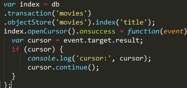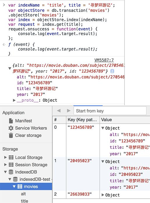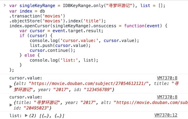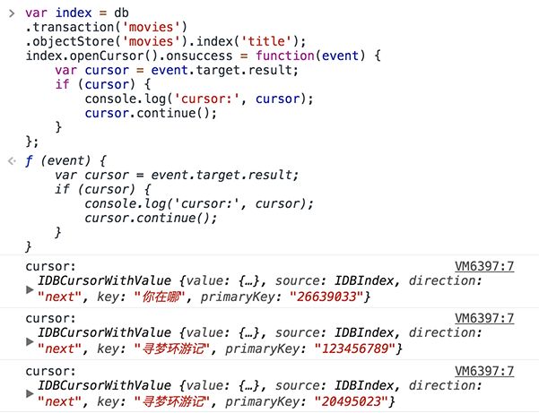 使用一次索引,我们只能得到一条数据; 如果我们需要得到所有title属性值为寻梦环游记的对象,我们可以使用游标.
