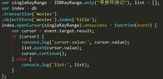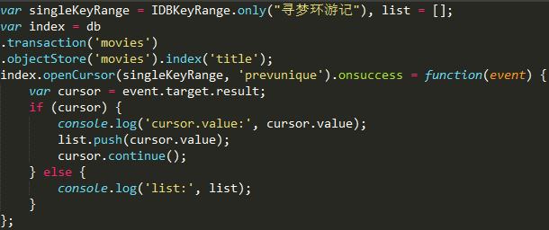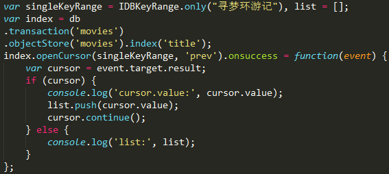 前面说到,我们要根据索引title获取所有title属性值为寻梦环游记的对象,要使用游标,而又不想遍历所有数据,这时就要用到openCursor()的第一个参数:keyRange