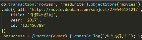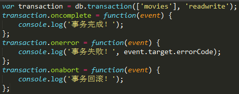 这样,我们得到一个事务对象transaction, 有三种事件可能会被触发: complete, error, abort. 现在,我们通过事务向数据库indexedDB-test的 对象存储空间movies中插入数据: