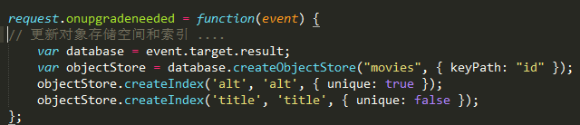onupgradeneeded 是我们唯一可以修改数据库结构的地方。在这里面,我们可以创建和删除对象存储空间以及构建和删除索引。