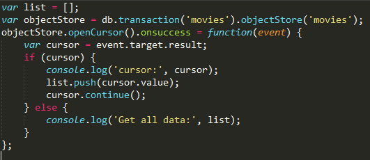 •在对象存储空间上使用: var cursor = objectStore.openCursor()