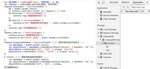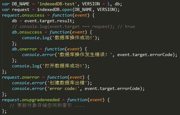 若是本域下不存在名为DB_NAME的数据库,则上述代码会创建一个名为DB_NAME、版本号为VERSION的数据库; 触发的事件依次为: upgradeneeded、 success.