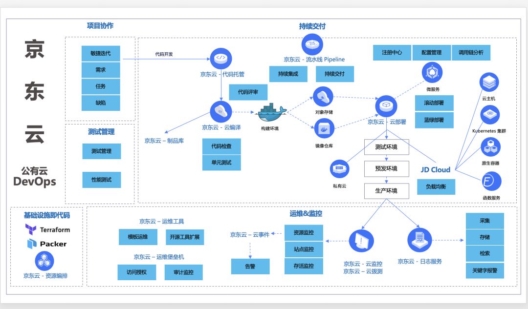 整个产品层面,京东云 DevOps 提供了代码托管、云编译、云部署、流水线、日志服务、云监控、云拨测、性能测试、测试管理、云翼 DevOps 平台等能力,京东云通过自身产品的能力进行整合,也形成了部署、测试、日志、监控方向的技术解决方案。