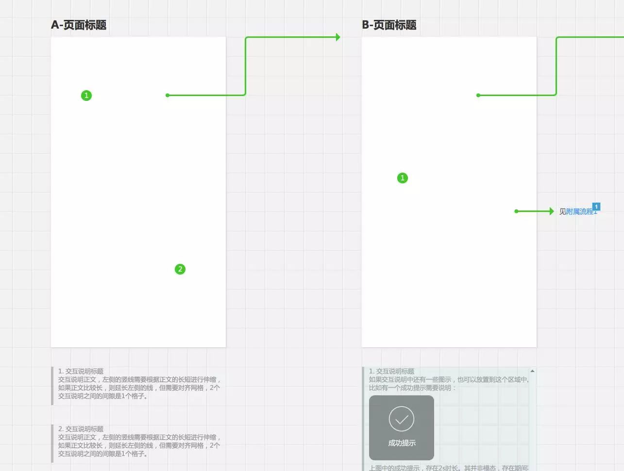 接近界面:因为设计说明是针对界面的解释,所以不能离界面太远,不然很难对着界面看说明。如果设计说明实在太多,可以采用动态面板的方式承载(交互稿模板附件中有示范);