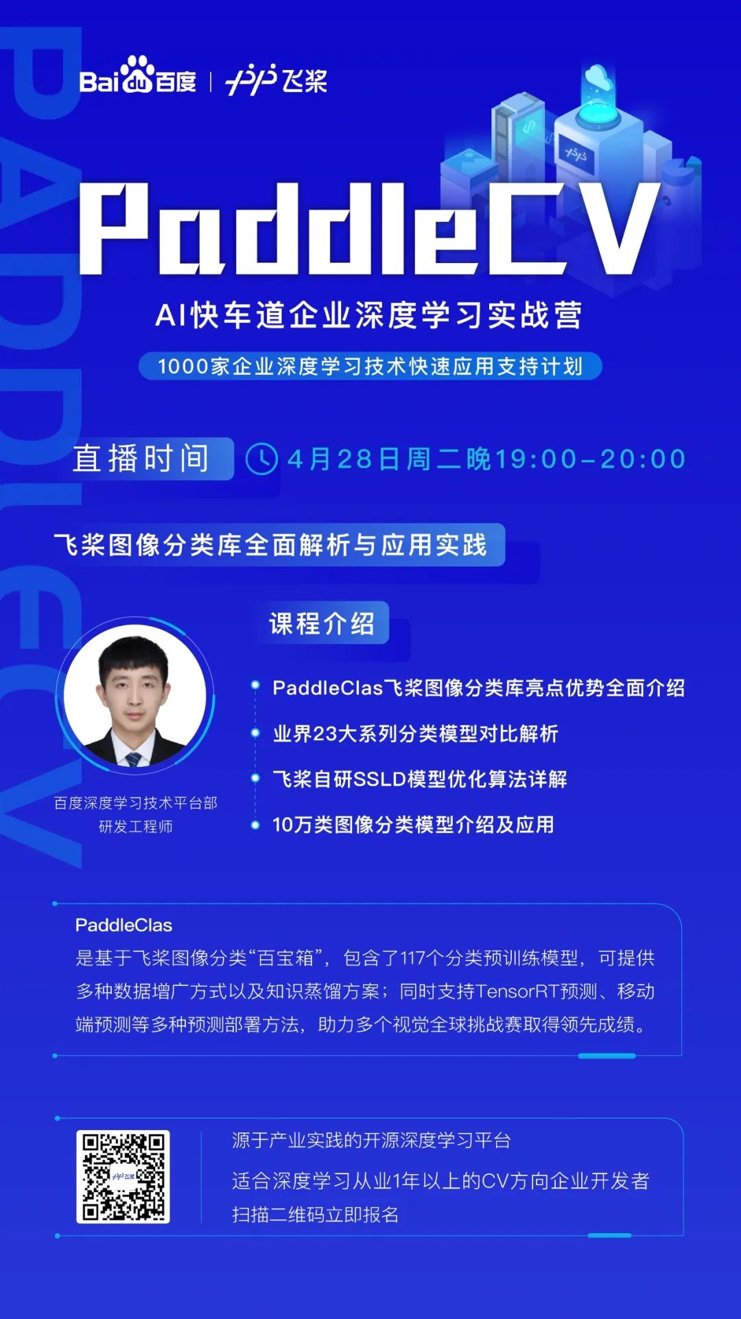 4月28日,首先“登场”的课程是“飞桨图像分类库全面解析与应用实践”,从图像分类开始探索CV的世界。图像分类作为CV的重要基本问题,可根据图像的语义信息将不同类别图像区分开来,是图像检测、图像分割、物体跟踪、行为分析等其他高层视觉任务的基础。本次课程中百度算法工程师会对图像分类及基于飞桨的图像分类库——PaddleClas进行介绍,更有飞桨自研SSLD模型优化算法详解,业界23大系列分类模型对比解析,以及10万类图像分类模型介绍及应用,大量干货的课程内容“充满”你的屏幕。