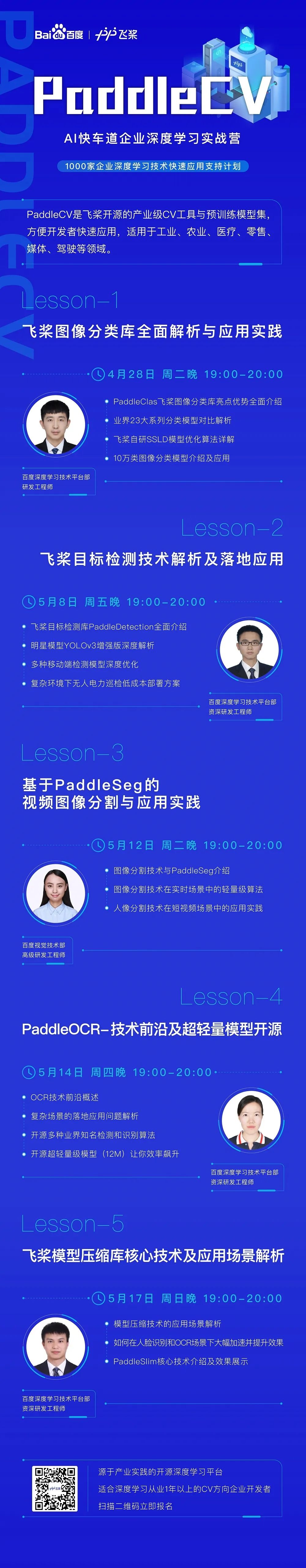 以线上授课的方式带领大家围绕计算机视觉的图像分类、目标检测、图像分割、各类文字识别及模型压缩这五大常见任务