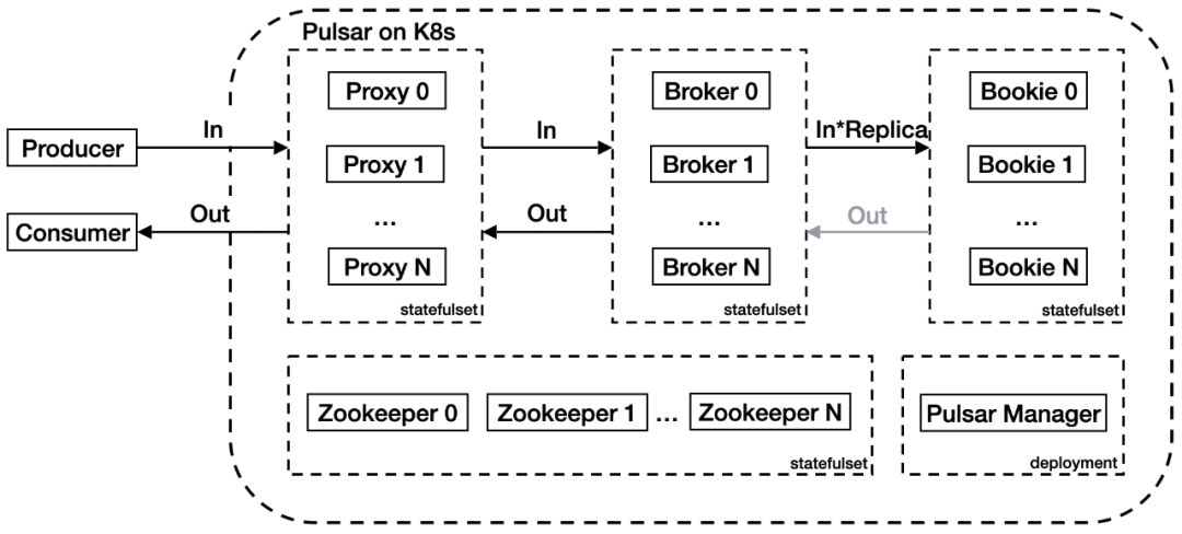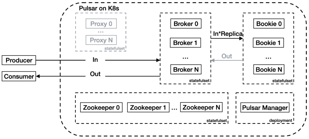 原生部署架构中,流量从 Proxy 代理层进入,经过 Broker 逻辑服务层写入 Bookie 存储层。Proxy 代理层代理客户端和 Broker 之间的连接,Broker 层管理 Topic,Bookie 层负责持久化消息存储。在上图中,入流量和出流量分别用 In 和 Out 进行标记,Replica 是配置的副本。