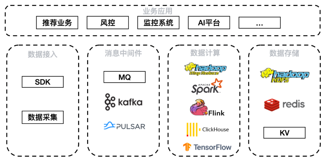 微信的业务场景包括推荐业务、风控、监控系统、AI 平台等。数据通过 SDK 和数据采集方式接入,经由 MQ、Kafka、Pulsar 消息中间件,其中 Pulsar 发挥了很大的作用。中间件下游接入数据计算层 Hadoop、Spark、Flink、ClickHouse、TensorFlow 等计算平台,由于本次介绍实时推荐场景,因此较多使用 Flink 和 TensorFlow。落地存储平台则包括 HDFS、HBase、Redis 以及各类自研 KV。