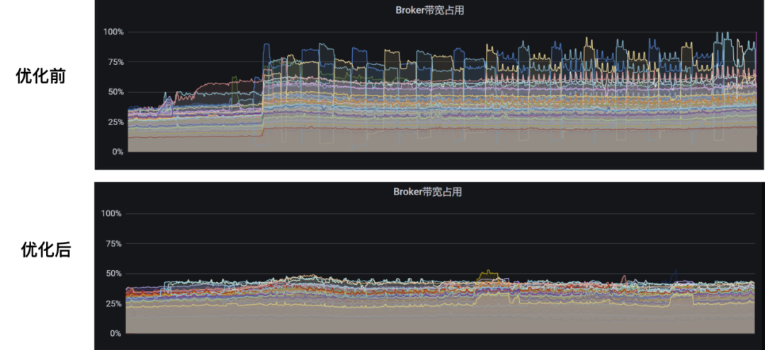 如上图,假设三个 Broker 平均负载是 50%,则阈值就是 60%,超出 60% 的部分需要均衡。但实际应用中发现 Broker 1 的多余 20% 负载会卸载到 Broker 2 上,之后由于 Broker 2 超载所以又会卸载下来,还会回到 Broker 1 上。结果流量就在 Broker 1 和 Broker 2 上反复横跳。