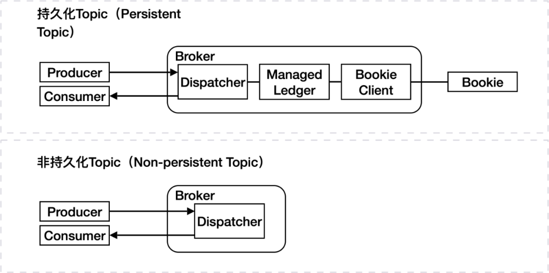 生产者和消费者是同 Broker 中的 Dispatcher 模块交互的,而持久化 Topic 中生产者数据会通过 Dispatcher 进入 Managed Ledger 模块,再调用 Bookie 客户端与 Bookie 交互。非持久化 Topic 中数据不会进入 Managed Ledger,而是直接发送给消费者。在大流量场景中,非持久化 Topic 由于不需要与 Bookie 交互,对集群的带宽压力会明显降低。