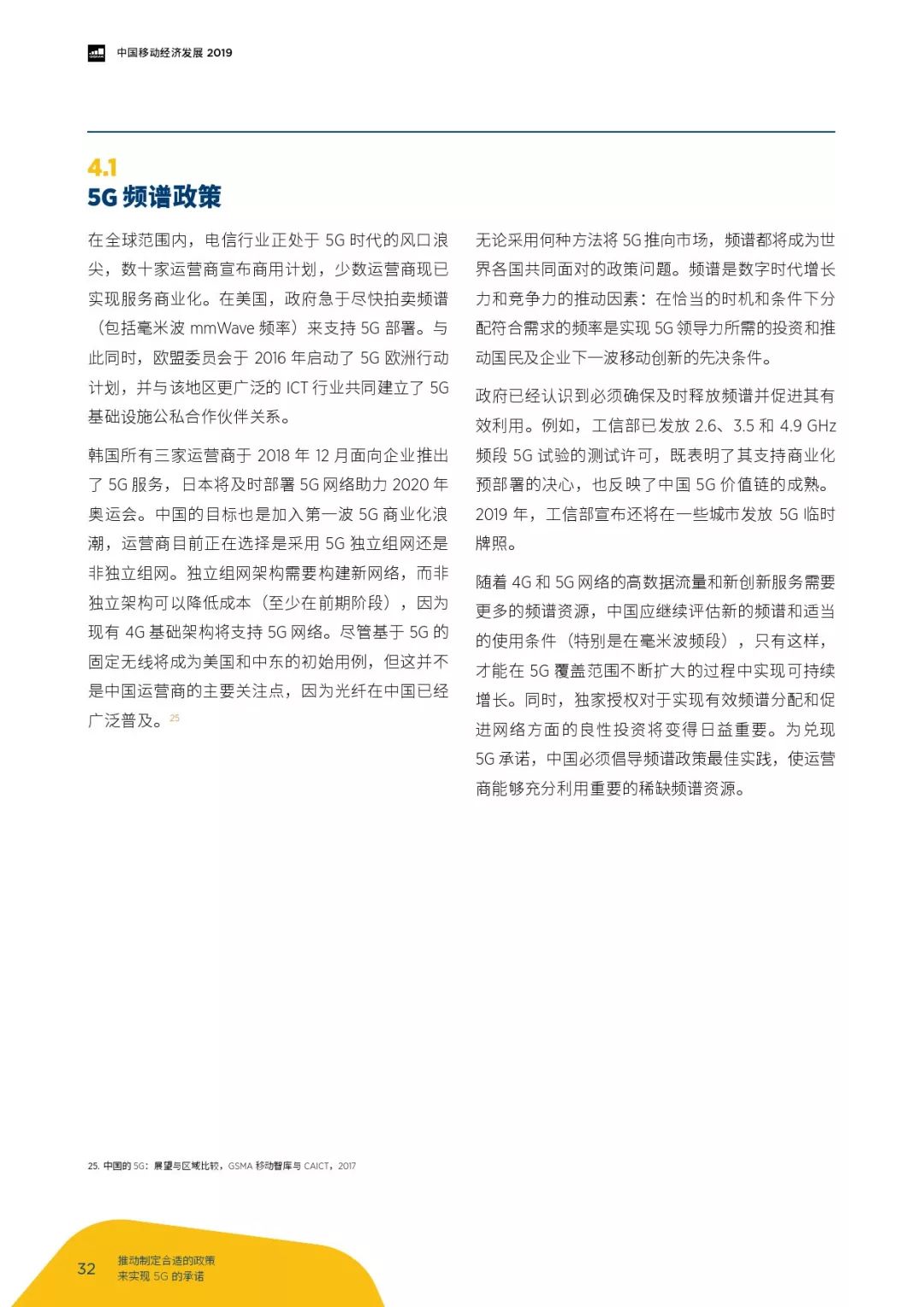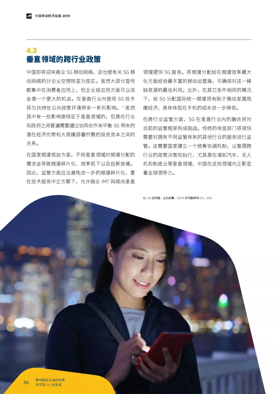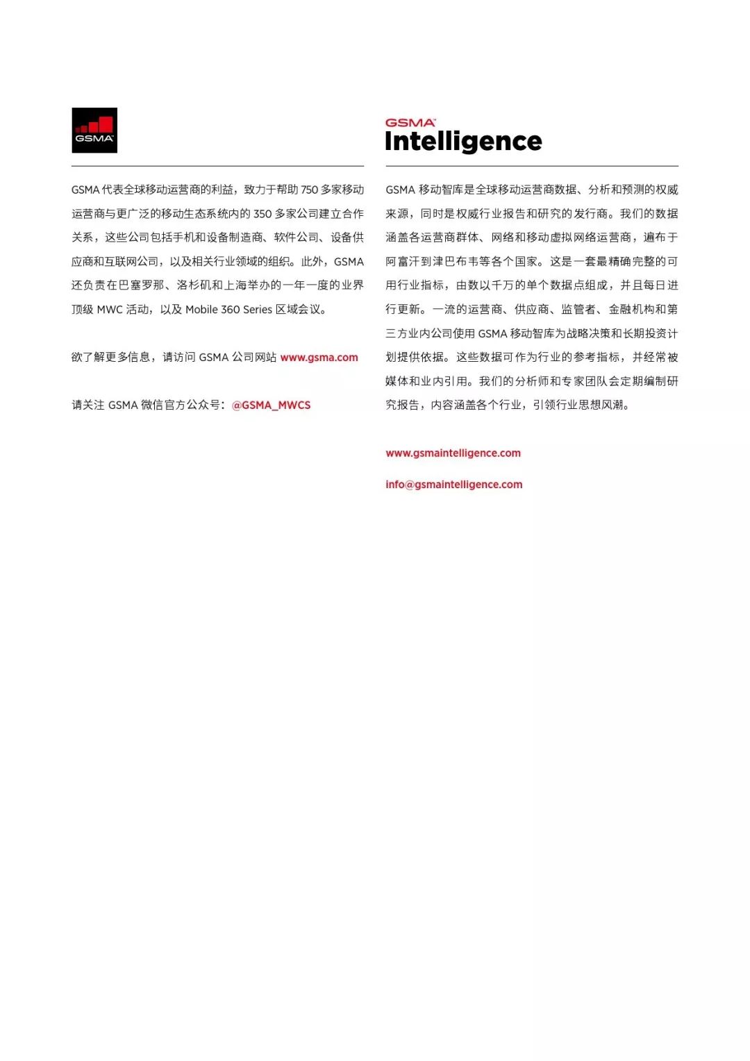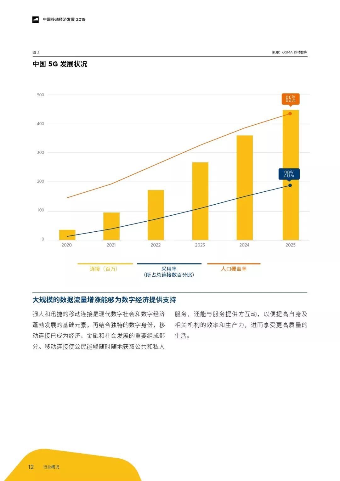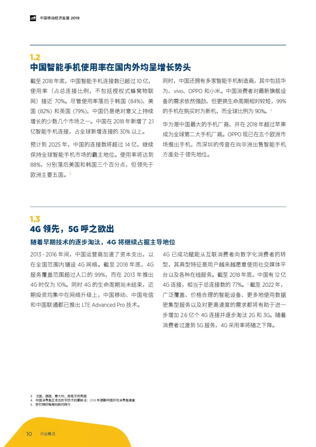 4G 已成功赋能从互联消费者向数字化消费者的转型,其典型特征是用户越来越愿意使用社交媒体平台以及各种在线服务。截至 2018 年底,中国有 12 亿4G 连接,相当于总连接数的 77%。截至 2022 年,广泛覆盖、价格合理的智能设备、更多地使用数据密集型服务以及对更高速度的需求都将有助于进一步增加 2.6 亿个 4G 连接并逐步淘汰 2G 和 3G。随着消费者过渡到 5G 服务,4G 采用率将随之下降。中国将与日本、韩国、美国和某些海湾国家一道,成为 5G 商用的领跑者,并将引领网络覆盖进程。GSMA 移动智库预测,到 2025 年,中国的 5G 连接数量将超过北美和欧洲的总和,位列全球第一。我们预计截至 2025 年底,中国的 5G 连接数将达到4.6 亿,占全国总连接数的 28%。