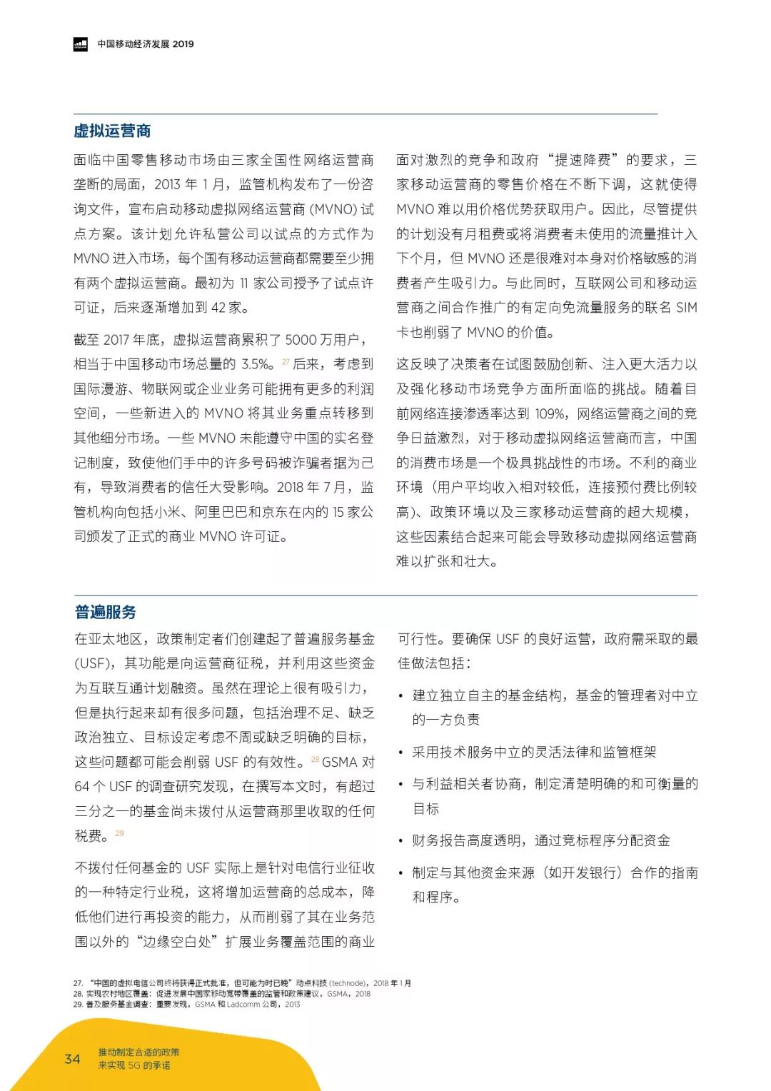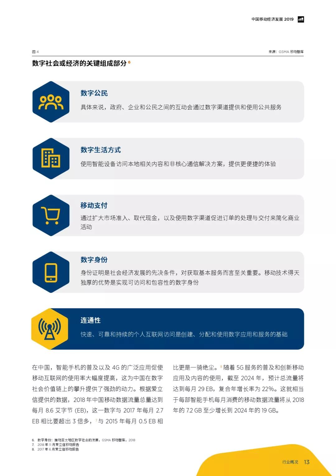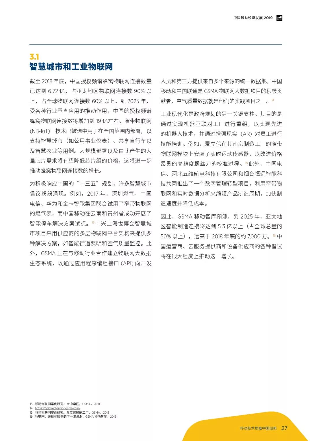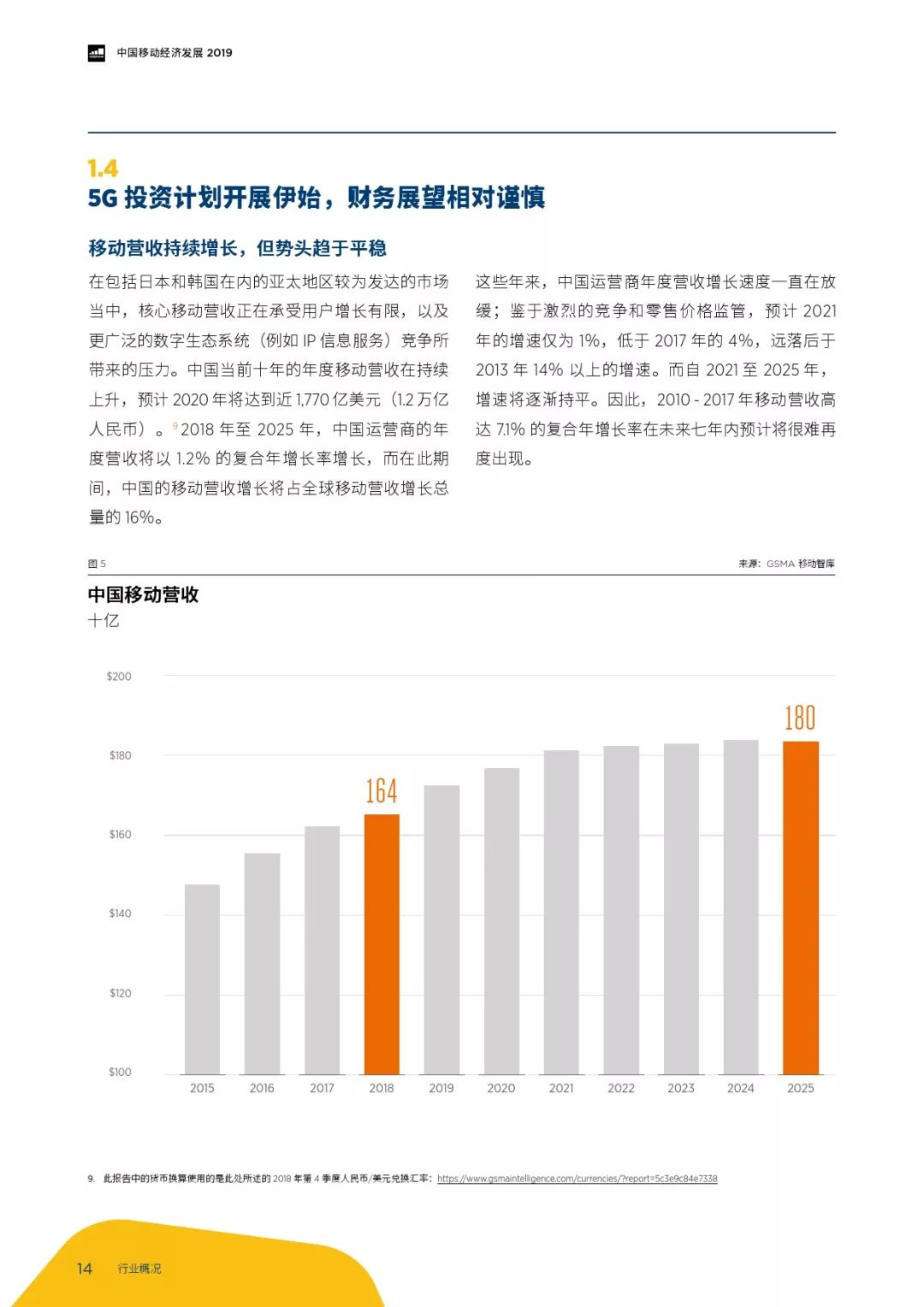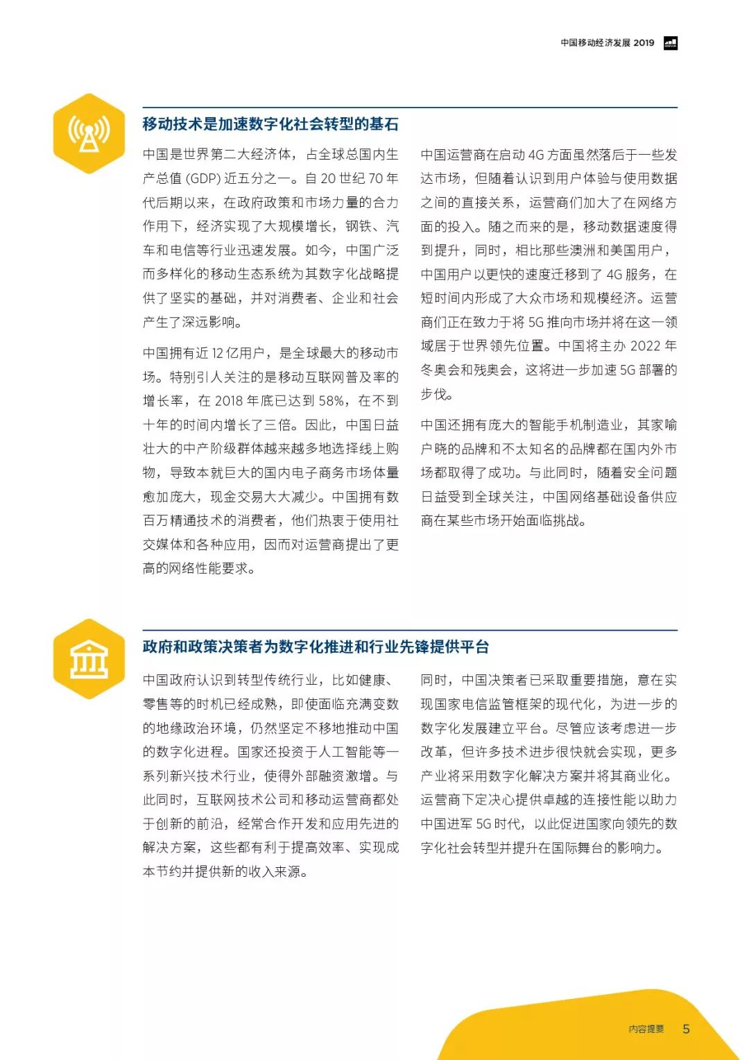 4G 已成功赋能从互联消费者向数字化消费者的转型,其典型特征是用户越来越愿意使用社交媒体平台以及各种在线服务。截至 2018 年底,中国有 12 亿4G 连接,相当于总连接数的 77%。截至 2022 年,广泛覆盖、价格合理的智能设备、更多地使用数据密集型服务以及对更高速度的需求都将有助于进一步增加 2.6 亿个 4G 连接并逐步淘汰 2G 和 3G。随着消费者过渡到 5G 服务,4G 采用率将随之下降。中国将与日本、韩国、美国和某些海湾国家一道,成为 5G 商用的领跑者,并将引领网络覆盖进程。GSMA 移动智库预测,到 2025 年,中国的 5G 连接数量将超过北美和欧洲的总和,位列全球第一。我们预计截至 2025 年底,中国的 5G 连接数将达到4.6 亿,占全国总连接数的 28%。
