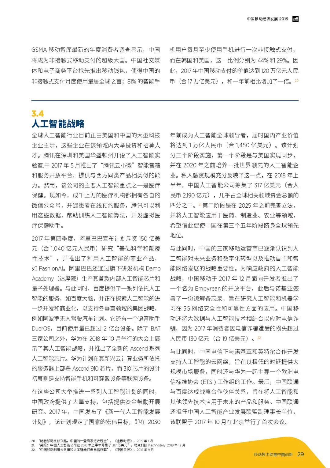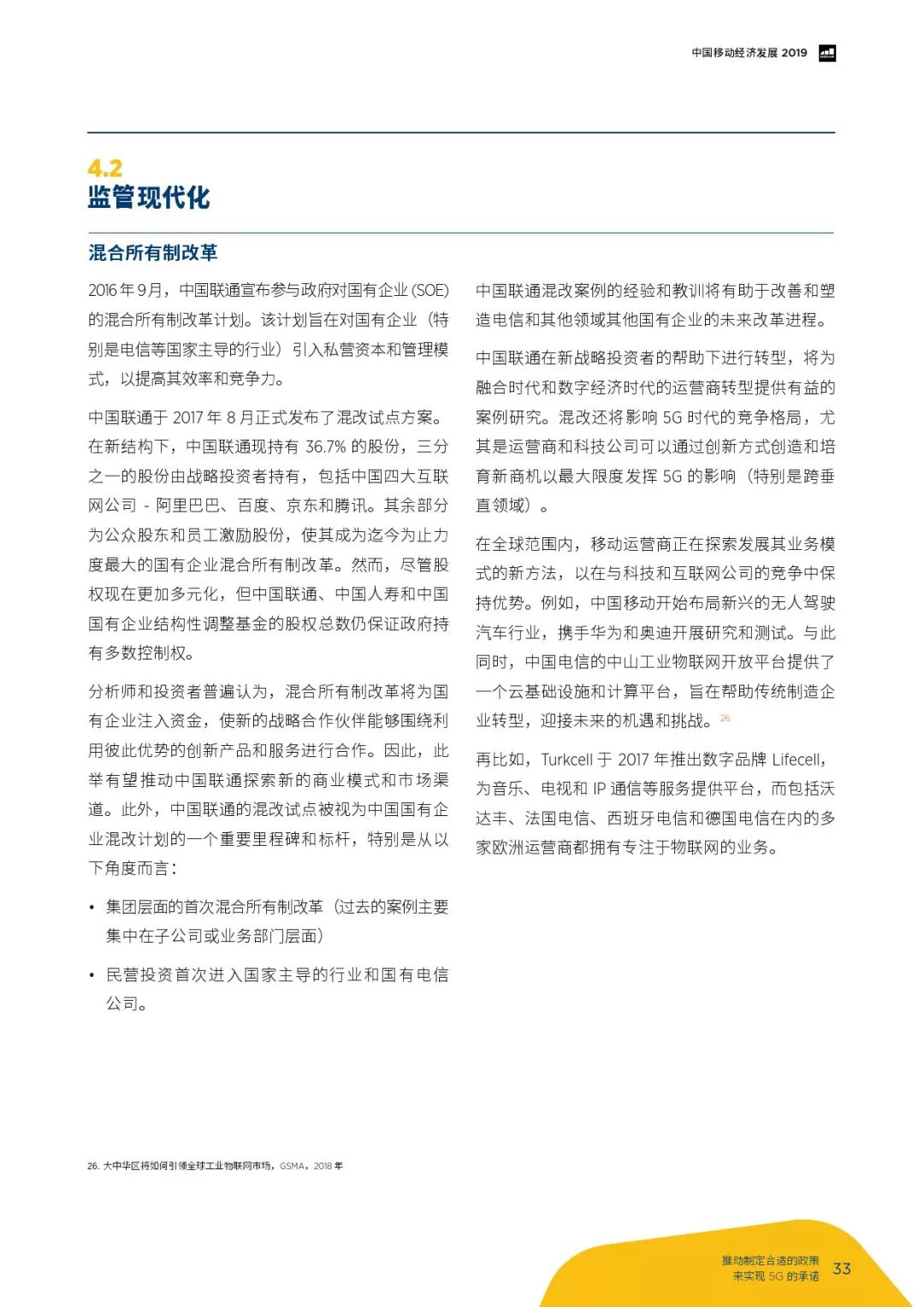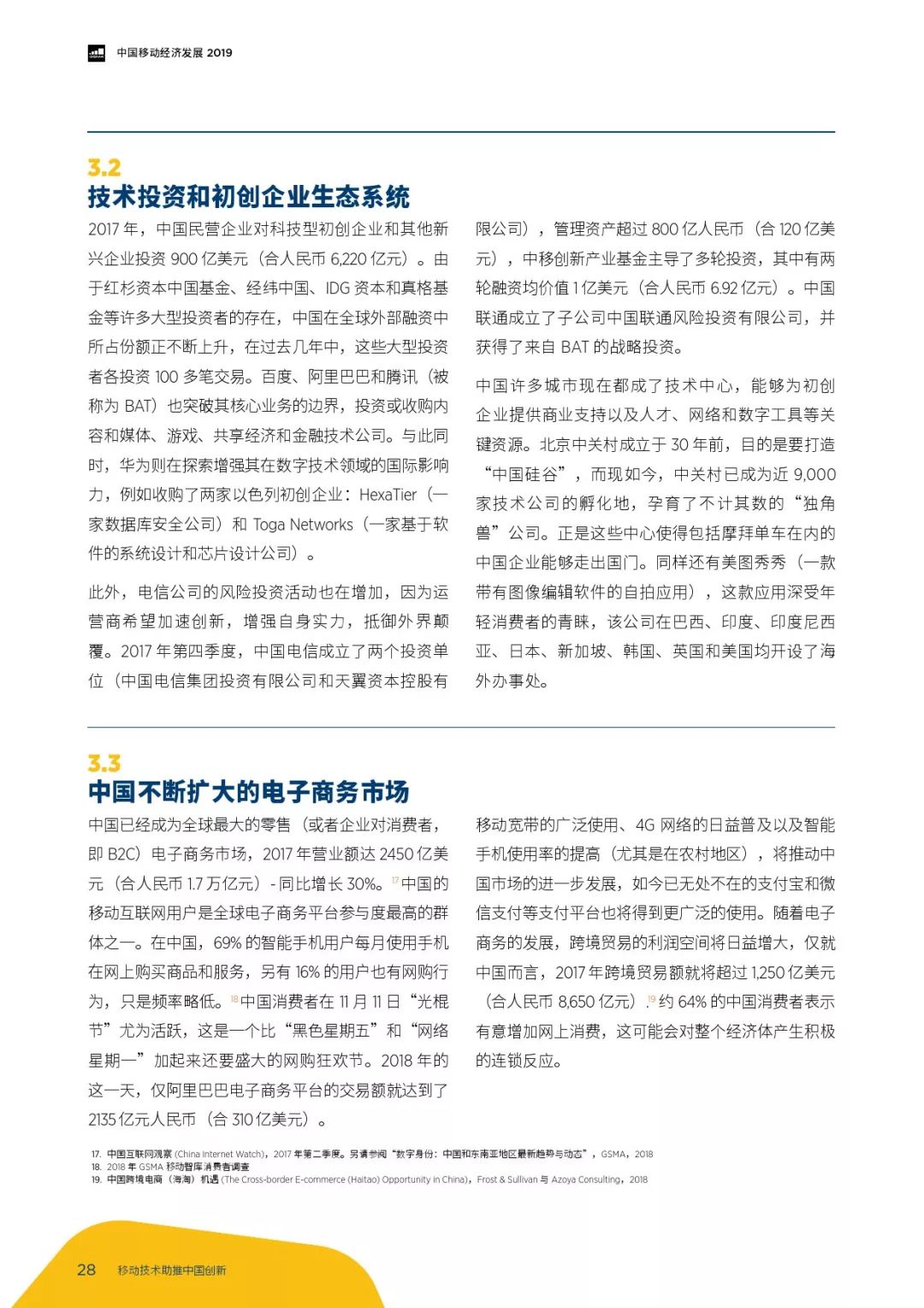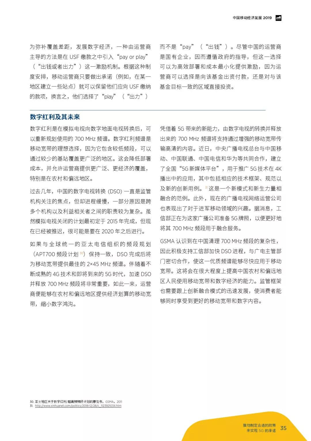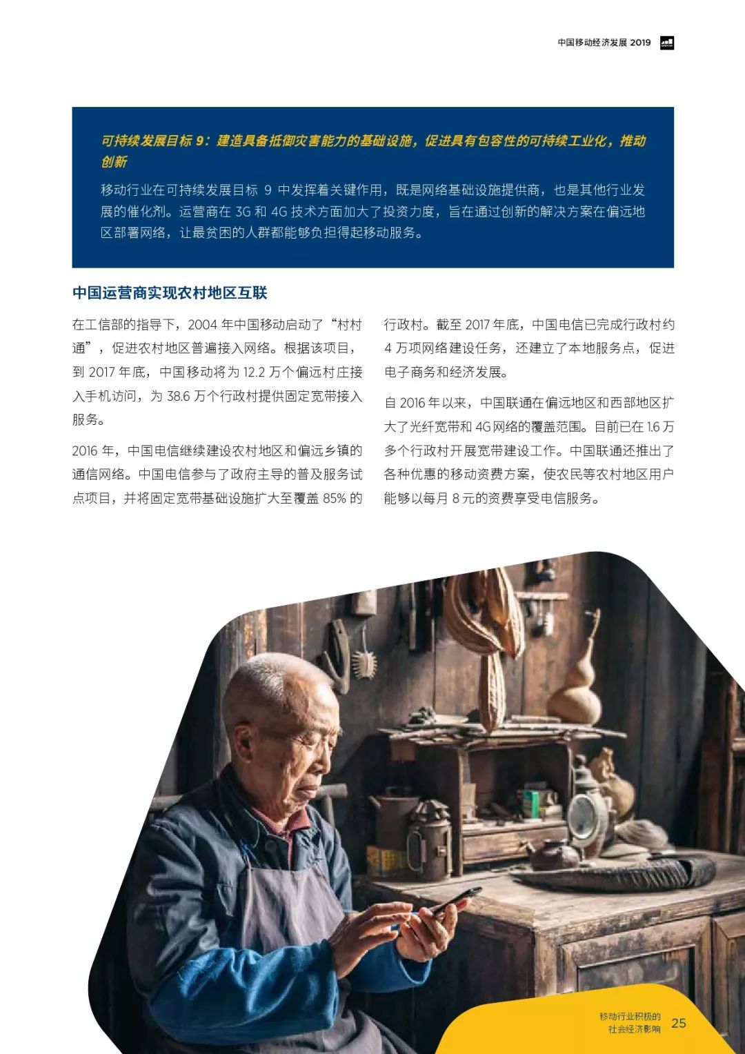 4G 已成功赋能从互联消费者向数字化消费者的转型,其典型特征是用户越来越愿意使用社交媒体平台以及各种在线服务。截至 2018 年底,中国有 12 亿4G 连接,相当于总连接数的 77%。截至 2022 年,广泛覆盖、价格合理的智能设备、更多地使用数据密集型服务以及对更高速度的需求都将有助于进一步增加 2.6 亿个 4G 连接并逐步淘汰 2G 和 3G。随着消费者过渡到 5G 服务,4G 采用率将随之下降。中国将与日本、韩国、美国和某些海湾国家一道,成为 5G 商用的领跑者,并将引领网络覆盖进程。GSMA 移动智库预测,到 2025 年,中国的 5G 连接数量将超过北美和欧洲的总和,位列全球第一。我们预计截至 2025 年底,中国的 5G 连接数将达到4.6 亿,占全国总连接数的 28%。