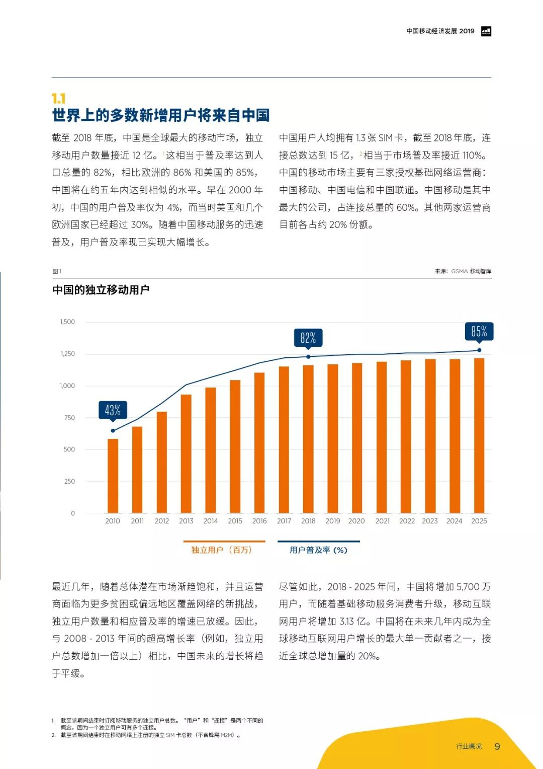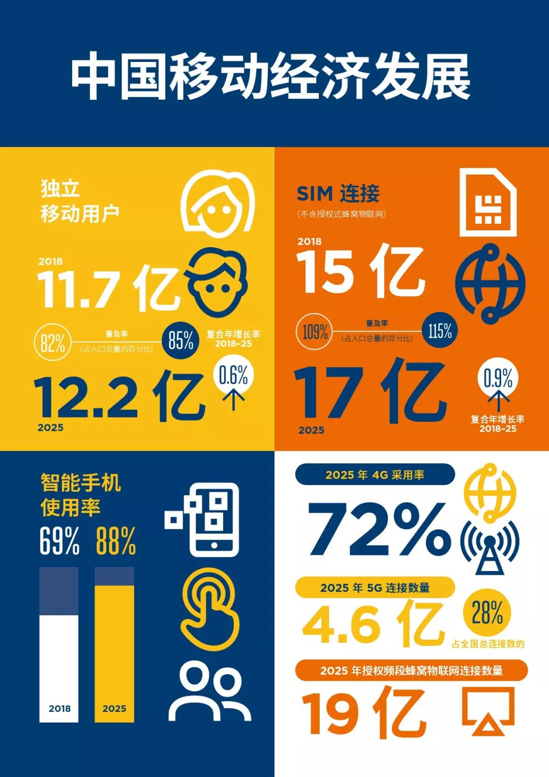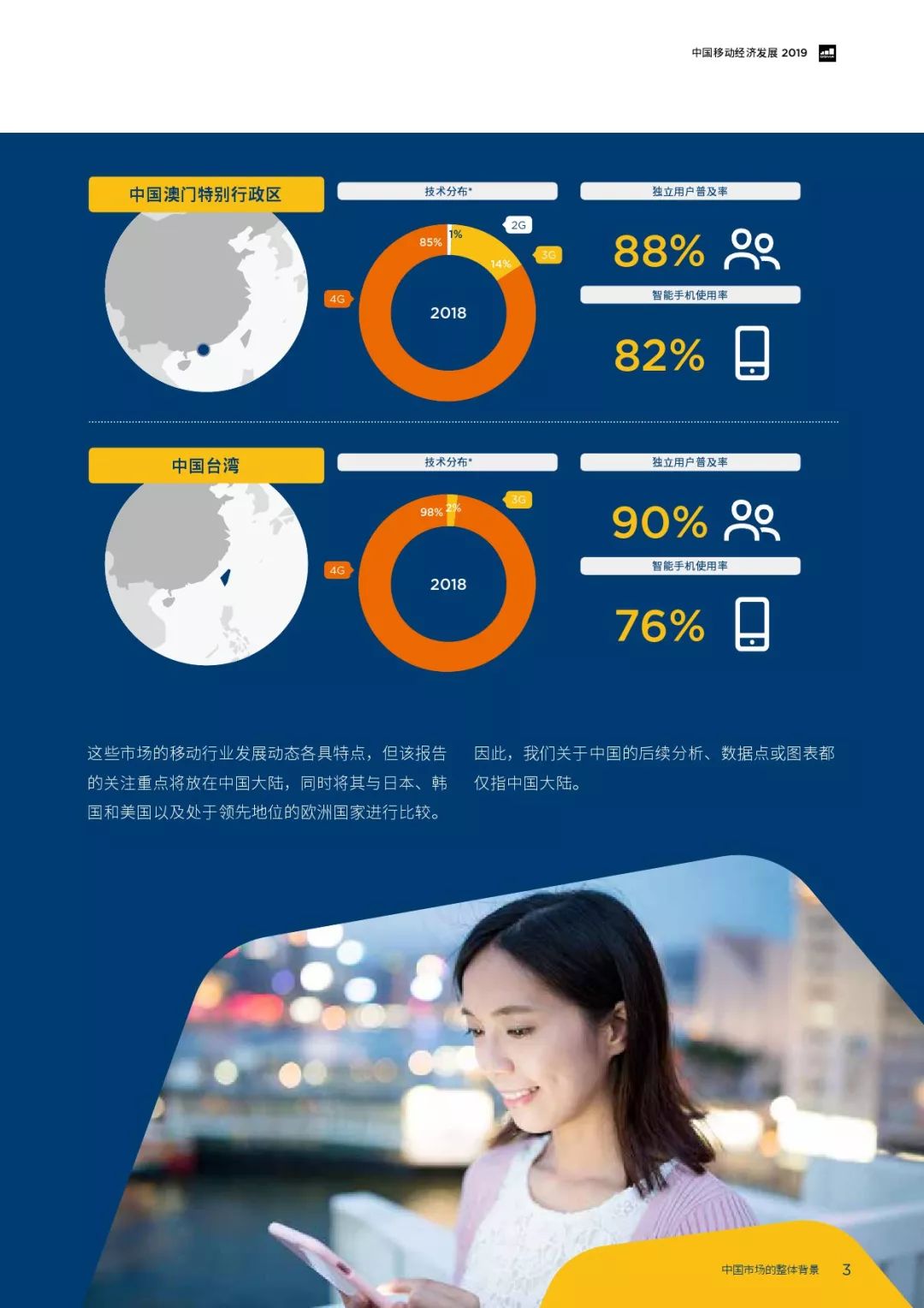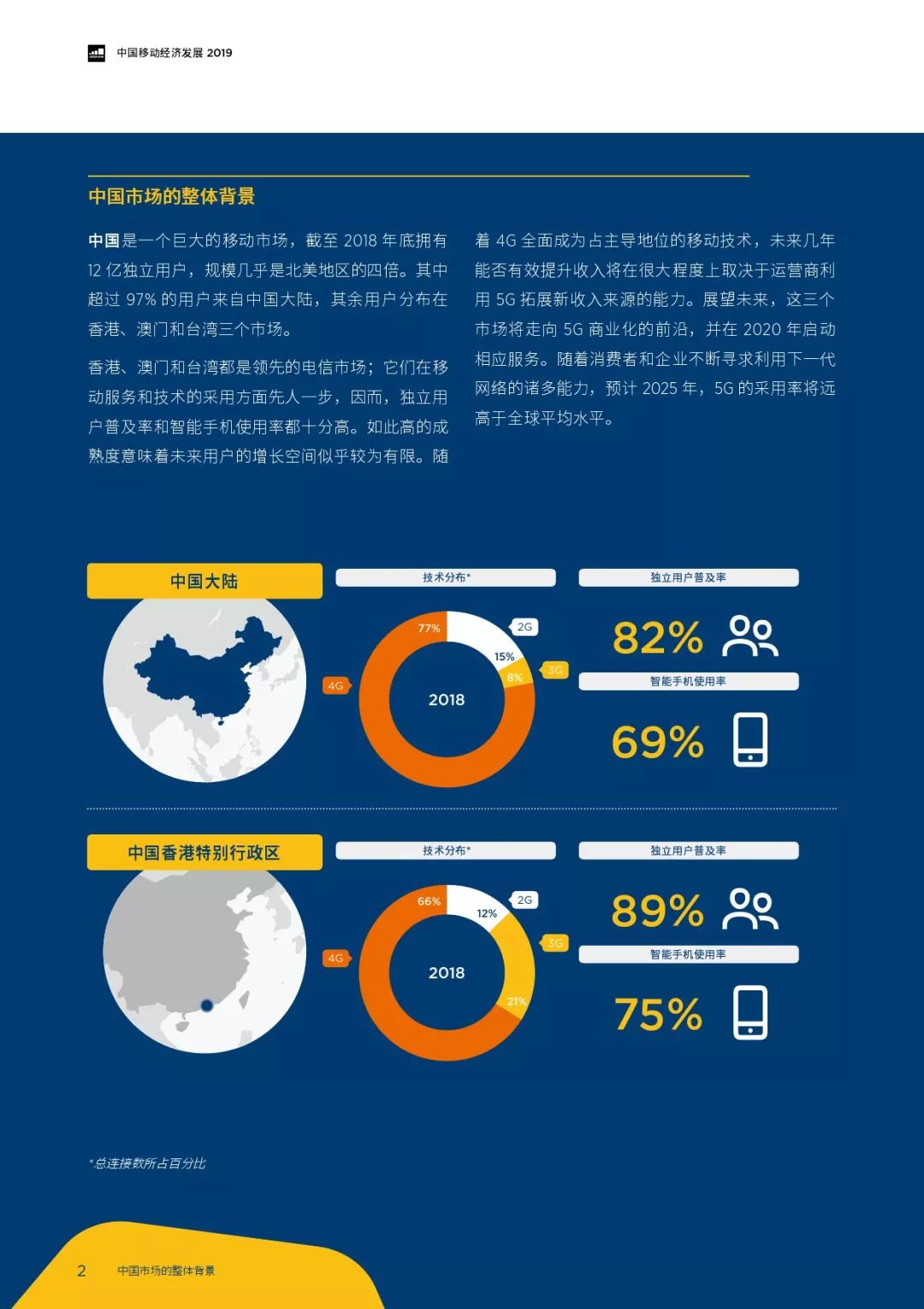 截至 2018 年底,中国是全球最大的移动市场,独立移动用户数量接近 12 亿。这相当于普及率达到人口总量的 82%,相比欧洲的 86% 和美国的 85%,中国将在约五年内达到相似的水平。