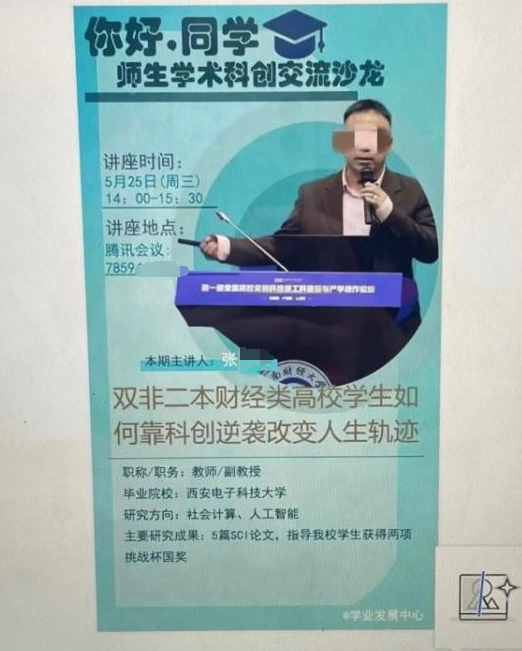 对此,5月25日下午,当事教师张某某进行了名为《双非二本财经类高校学生如何靠科创逆袭改变人生轨迹》的讲座。