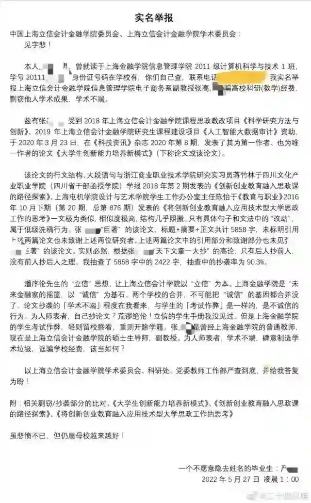 还有学生曾写了实名举报信,举报张某某涉嫌学术不端。